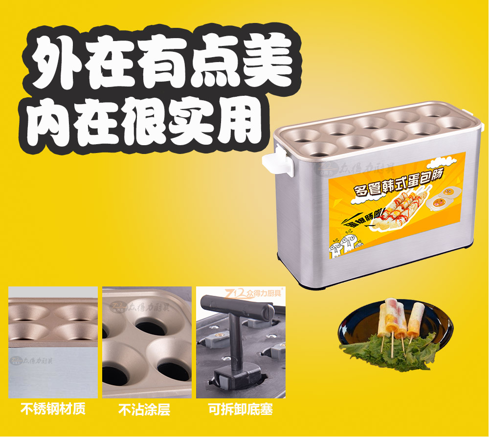 燃氣蛋腸機,電熱蛋腸機,快速升溫,360度環繞加熱,5分鐘即可做出鮮嫩的蛋腸,一次做十個蛋卷,平均每半分鐘即可烤熟一根,有效縮短等待時間,提高產品銷售額,蛋腸蛋卷美味吸引過往人群,小吃致富首選小設備,操作簡單。眾得力廚具,給我一個空間,服務一輩子。