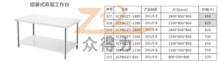 眾得力廚具為您提供中央廚房一站式服務,生產銷售食品機械、商用廚具系列設備,白鋼調理品,本操作臺有雙層和三層之分,且有1.5米和1.8米規格,均采用1mm標準板材加工設計,用料足